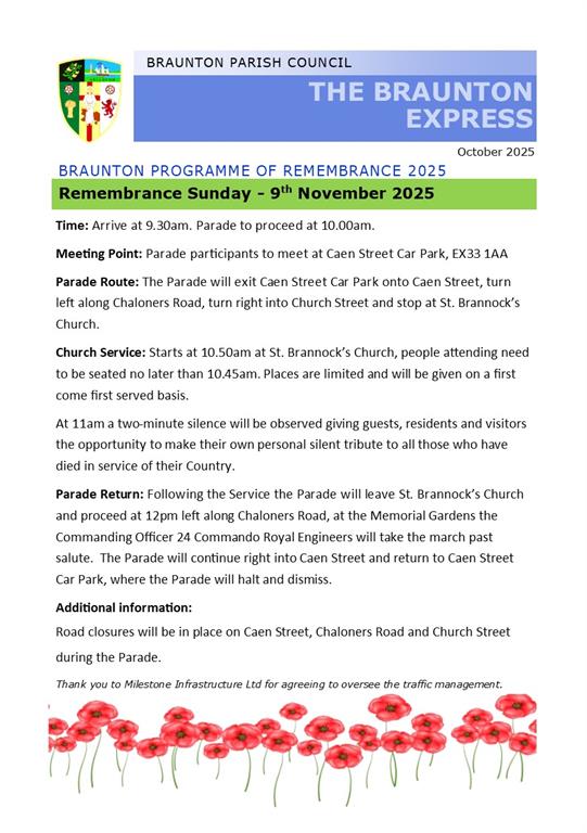 The Braunton Express is produced monthly. The aim of the newsletter is to keep residents of the Parish as informed as possible regarding the Council's activities and to use it to form part of any consultation process on any major issues that may arise.